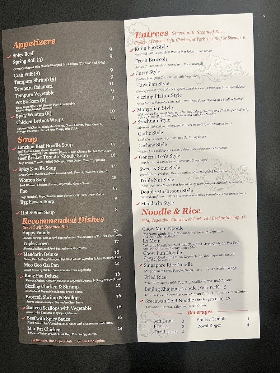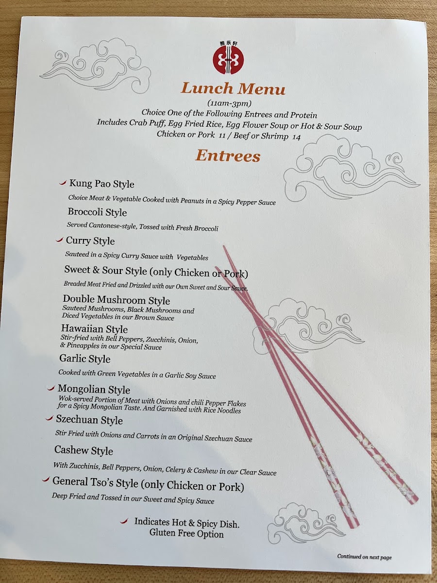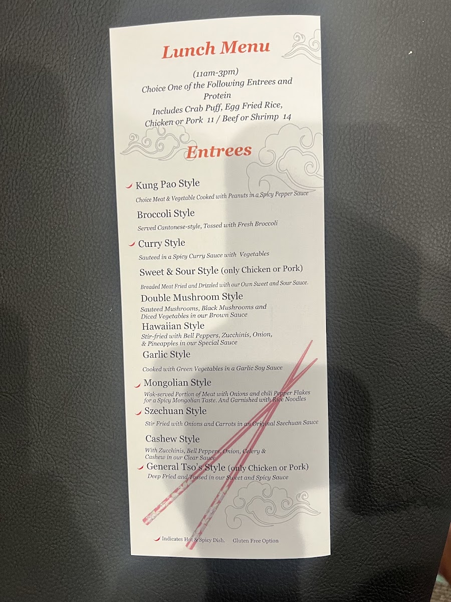Entrées range from spicy and savory dishes like Mongolian Style beef and shrimp in garlic sauce to comforting, saucy classics like General Tso's chicken and chicken with broccoli. These meals pair nicely with sides of white rice or noodles, making it easy to customize your dining experience whether you're craving something spicy, mild, or somewhere in between.